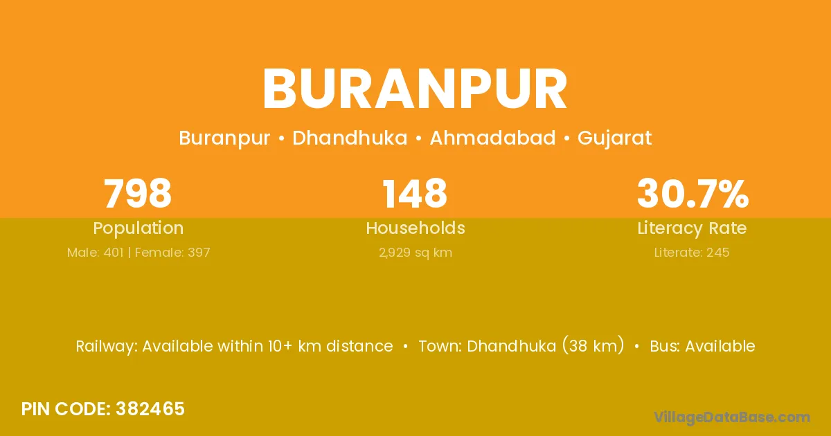 The literacy rate of Buranpur village is 67.20%. Male literacy stands at 76.25% and female literacy at 58.24%.