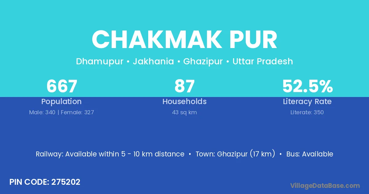 Ghazipur (17 km) is the nearest town to Chakmak Pur village for major economic activities and is located approximately 17 km away.