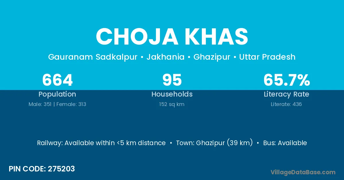 Ghazipur (39 km) is the nearest town to Choja Khas village for major economic activities and is located approximately 39 km away.