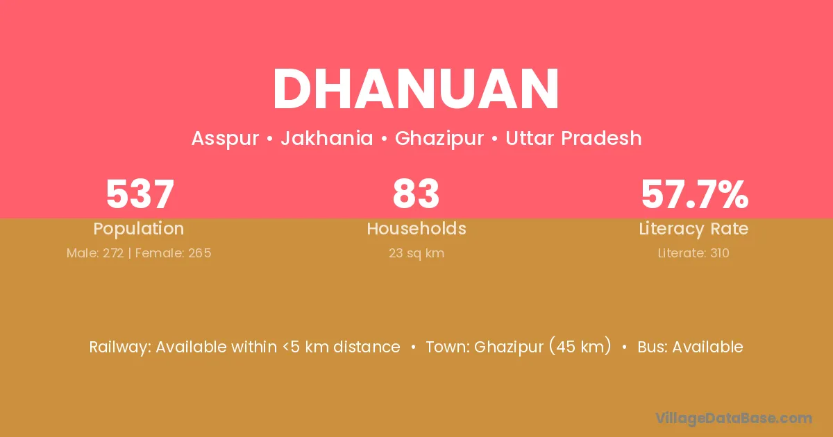 Ghazipur (45 km) is the nearest town to Dhanuan village for major economic activities and is located approximately 45 km away.