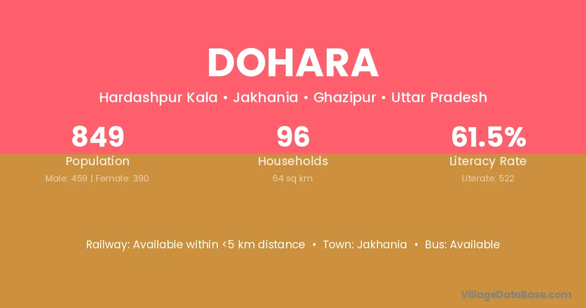 Dohara village has a total population of 849 people, of which 459 are males and 390 are females.