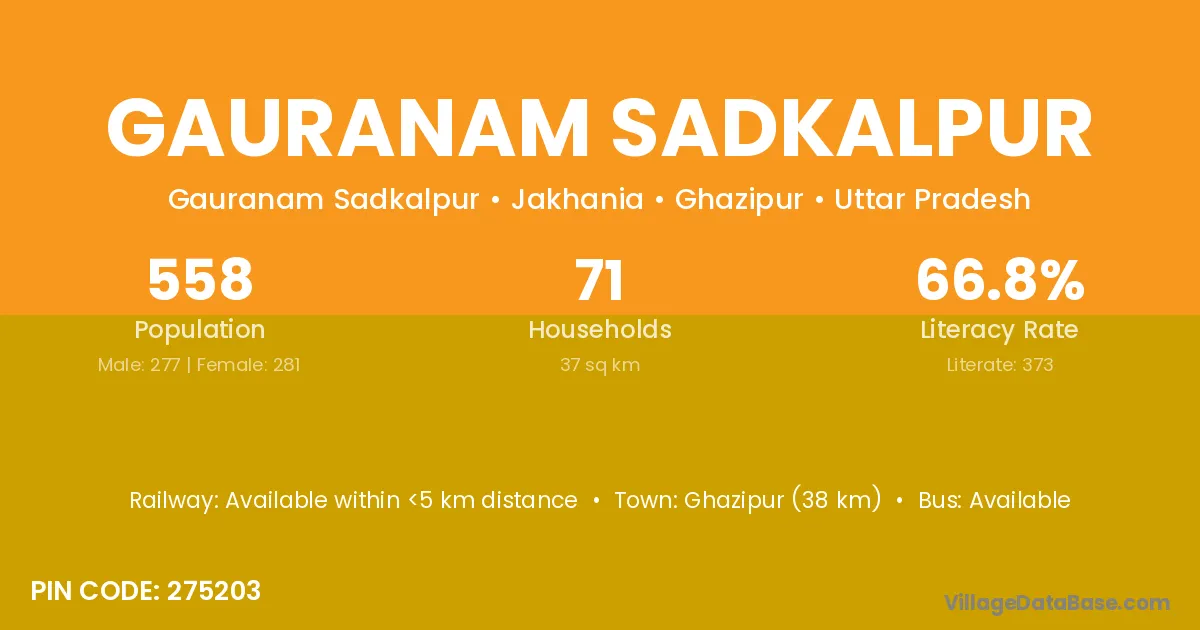 Gauranam Sadkalpur village has a total population of 558 people, of which 277 are males and 281 are females.