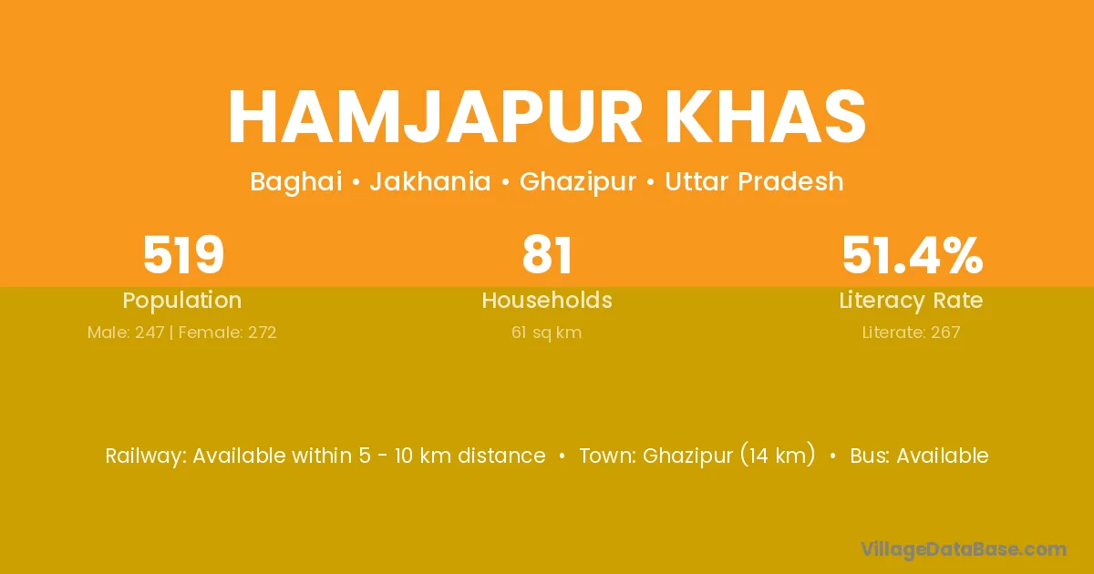 Ghazipur (14 km) is the nearest town to Hamjapur Khas village for major economic activities and is located approximately 14 km away.