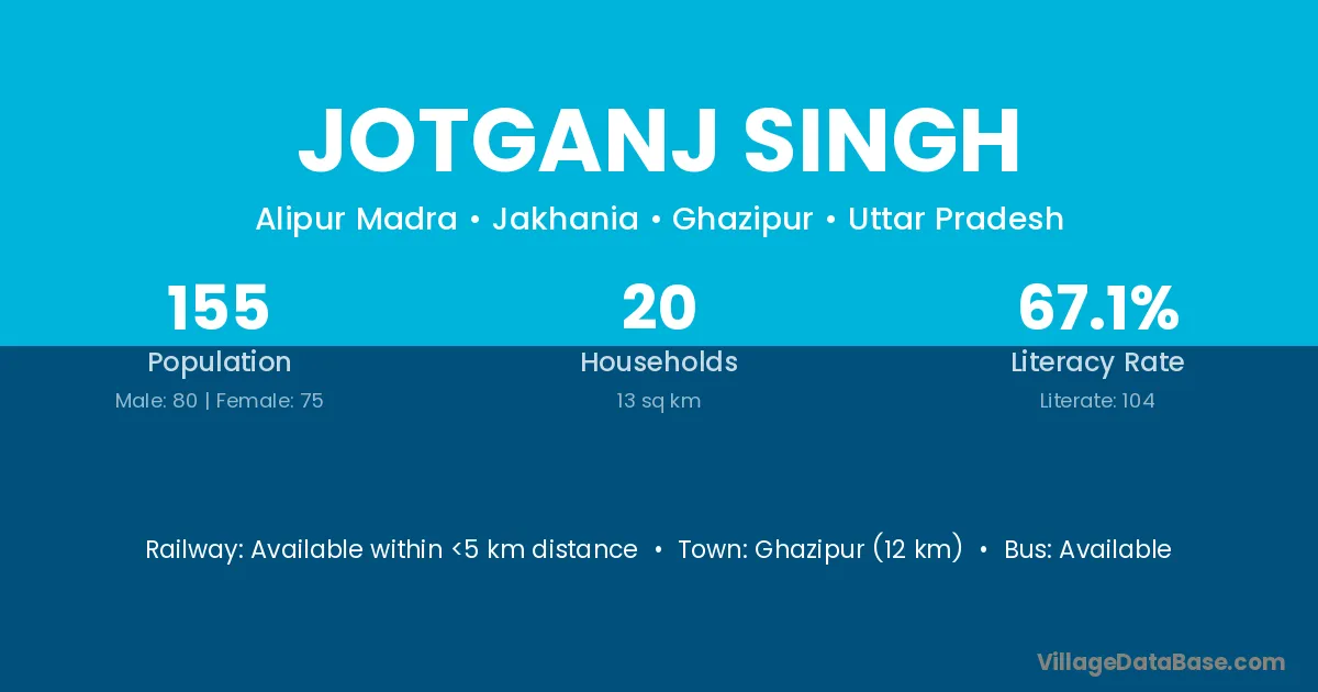 Ghazipur (12 km) is the nearest town to Jotganj Singh village for major economic activities and is located approximately 12 km away.