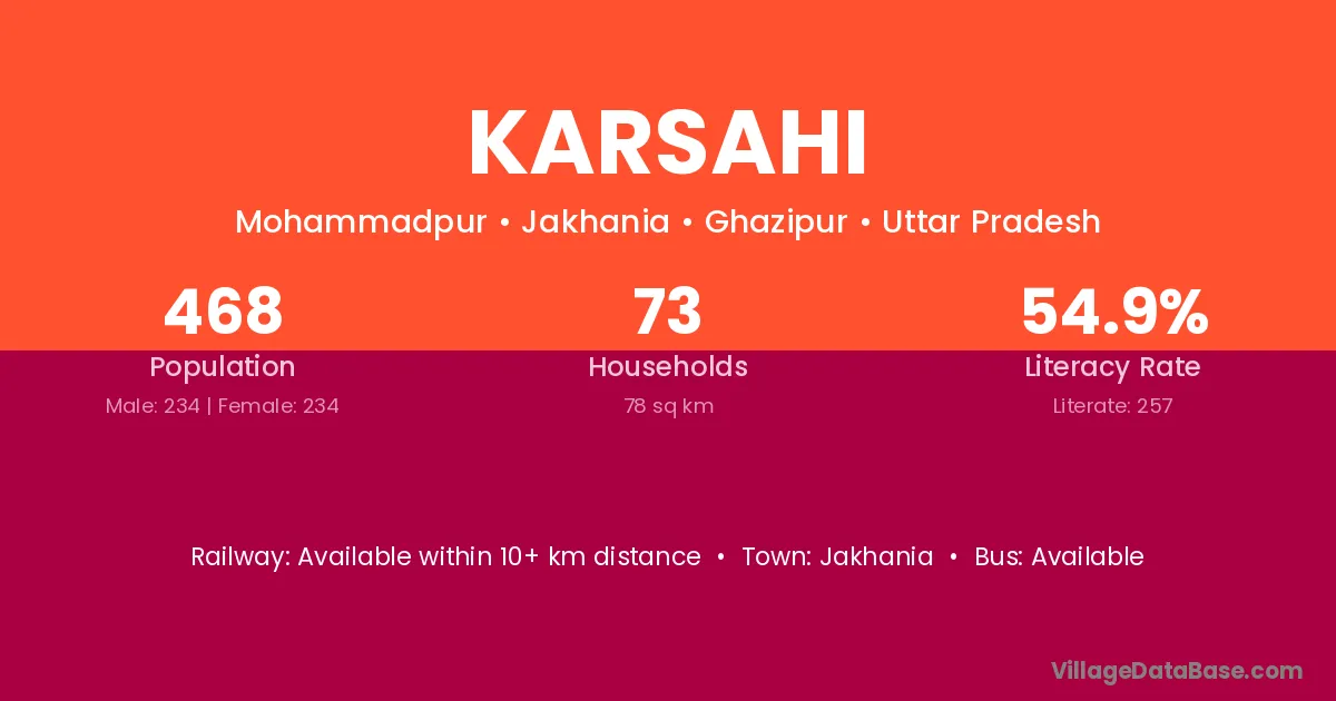 Karsahi village has a total population of 468 people, of which 234 are males and 234 are females.