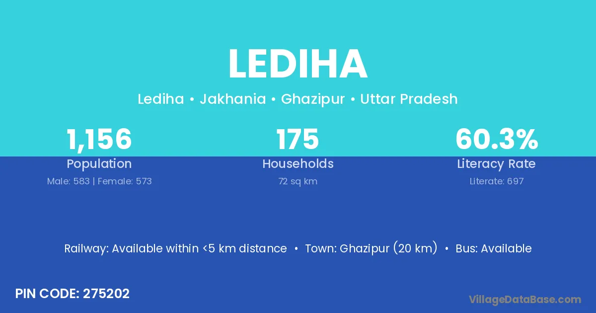 Ghazipur (20 km) is the nearest town to Lediha village for major economic activities and is located approximately 20 km away.