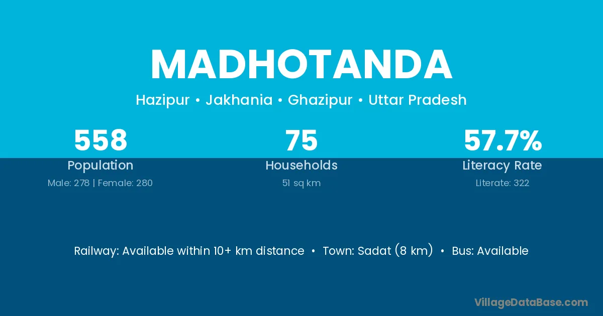 Madhotanda village has a total population of 558 people, of which 278 are males and 280 are females.