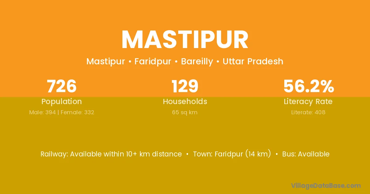 Mastipur village has a total population of 454 people, of which 222 are males and 232 are females.