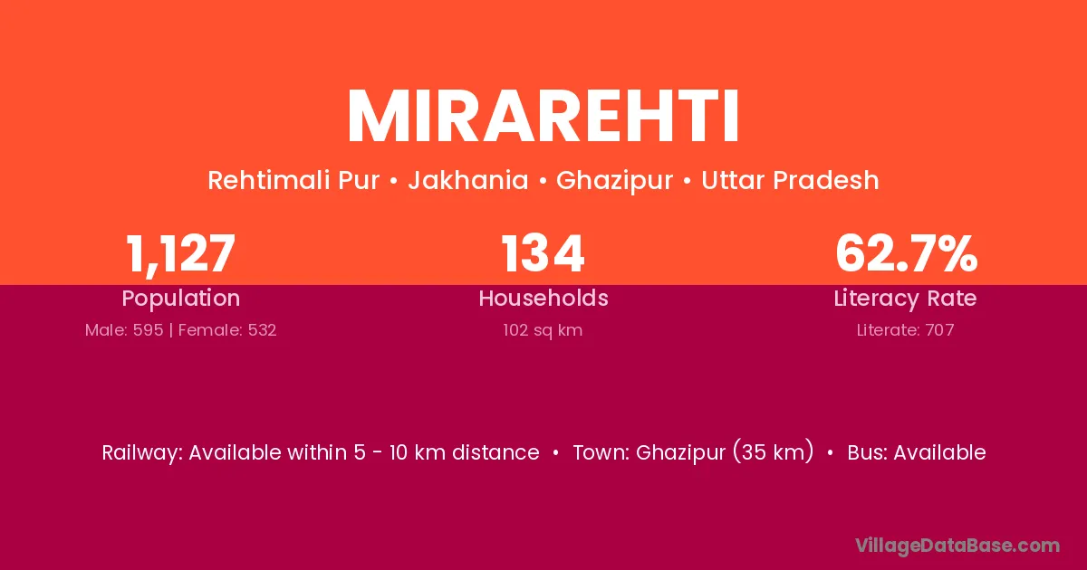 Ghazipur (35 km) is the nearest town to Mirarehti village for major economic activities and is located approximately 35 km away.