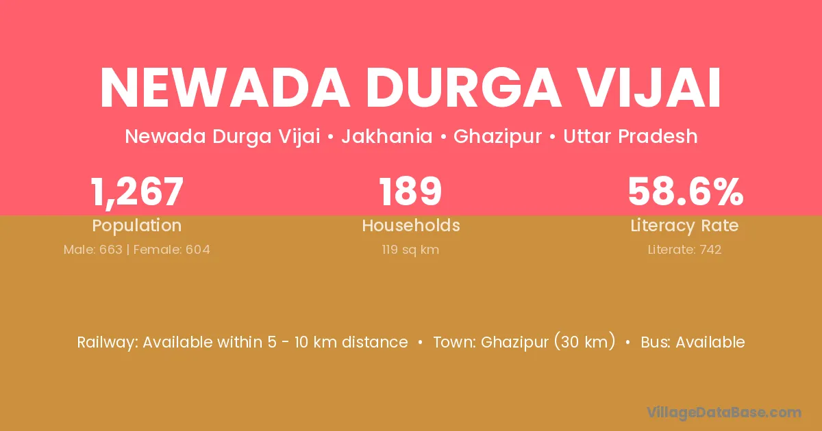 Ghazipur (30 km) is the nearest town to Newada Durga Vijai village for major economic activities and is located approximately 30 km away.