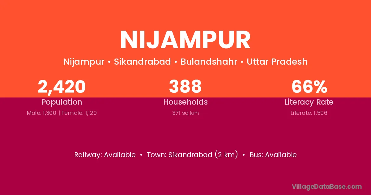 The literacy rate of Nijampur village is 45.82%. Male literacy stands at 57.46% and female literacy at 34.75%.