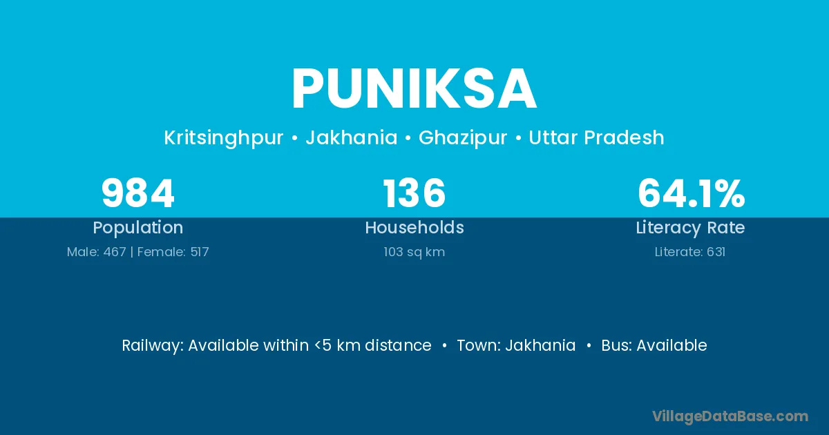 Puniksa village has a total population of 984 people, of which 467 are males and 517 are females.