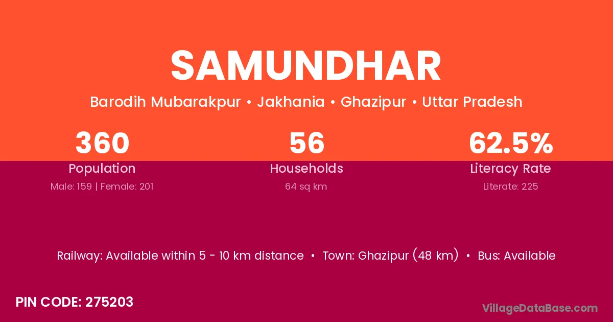 Ghazipur (48 km) is the nearest town to Samundhar village for major economic activities and is located approximately 48 km away.
