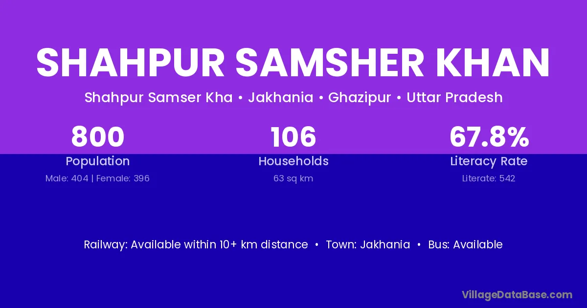 Jakhania is the nearest town to Shahpur Samsher Khan village for major economic activities