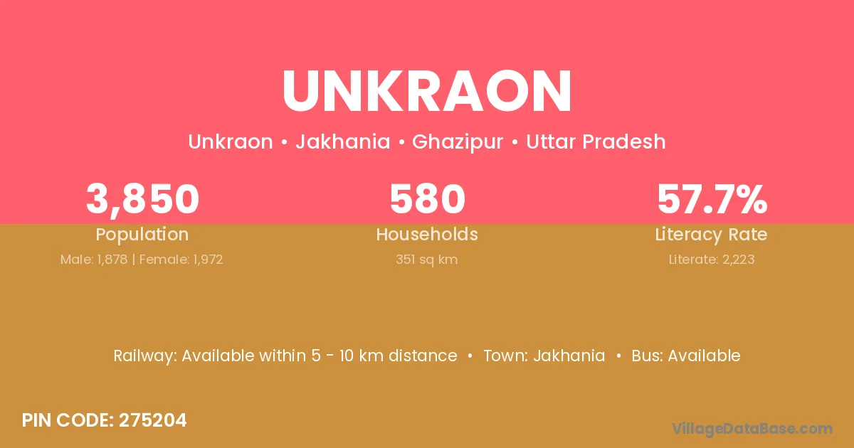 Unkraon village has a total population of 3,850 people, of which 1,878 are males and 1,972 are females.