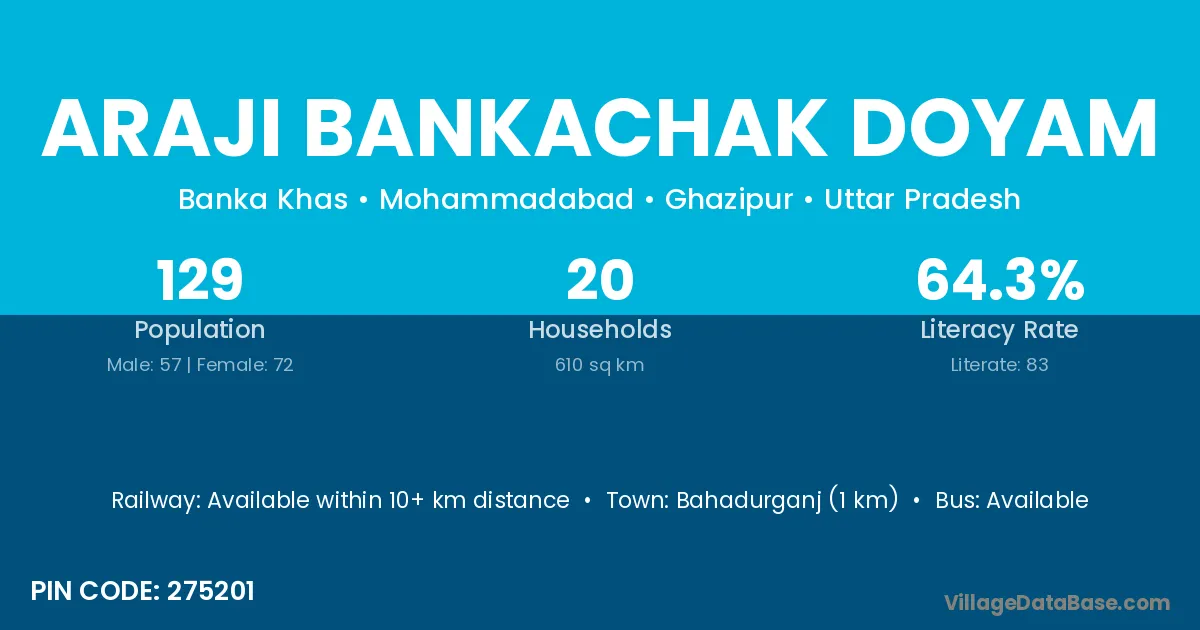 The literacy rate of Araji Bankachak Doyam village is 64.34%. Male literacy stands at 70.18% and female literacy at 59.72%.