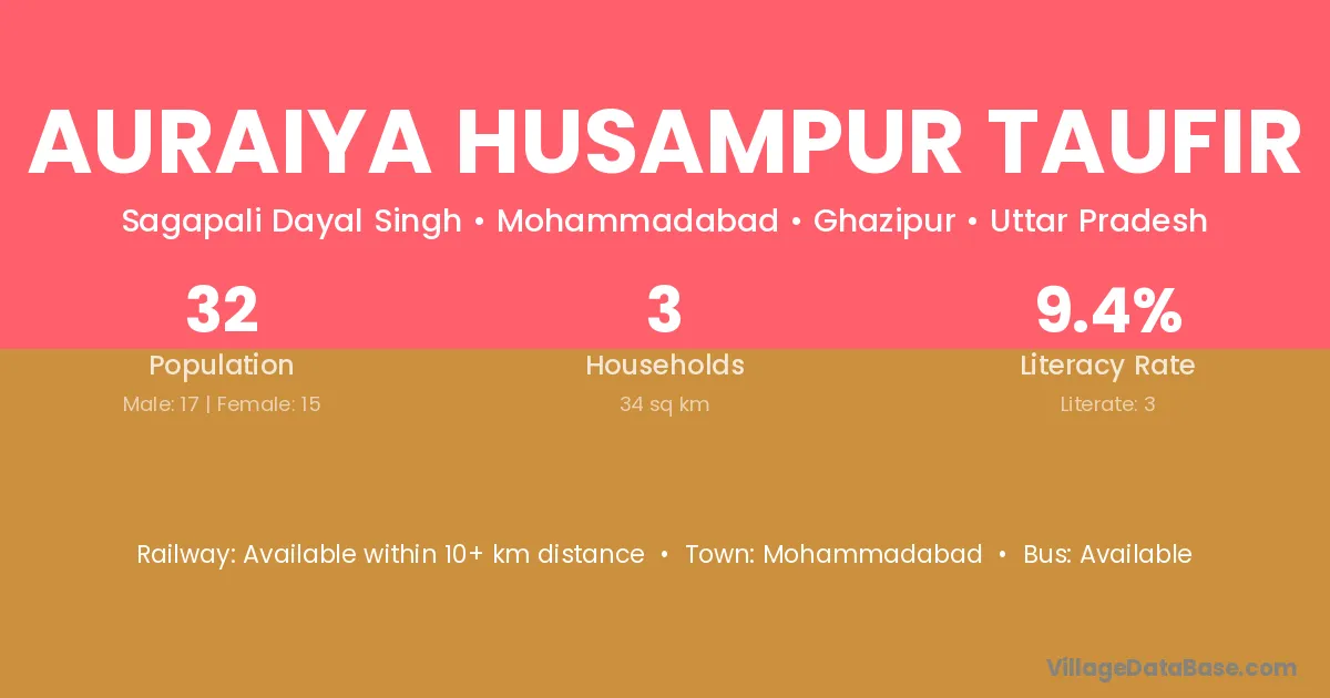 Auraiya Husampur Taufir village has a total population of 32 people, of which 17 are males and 15 are females.