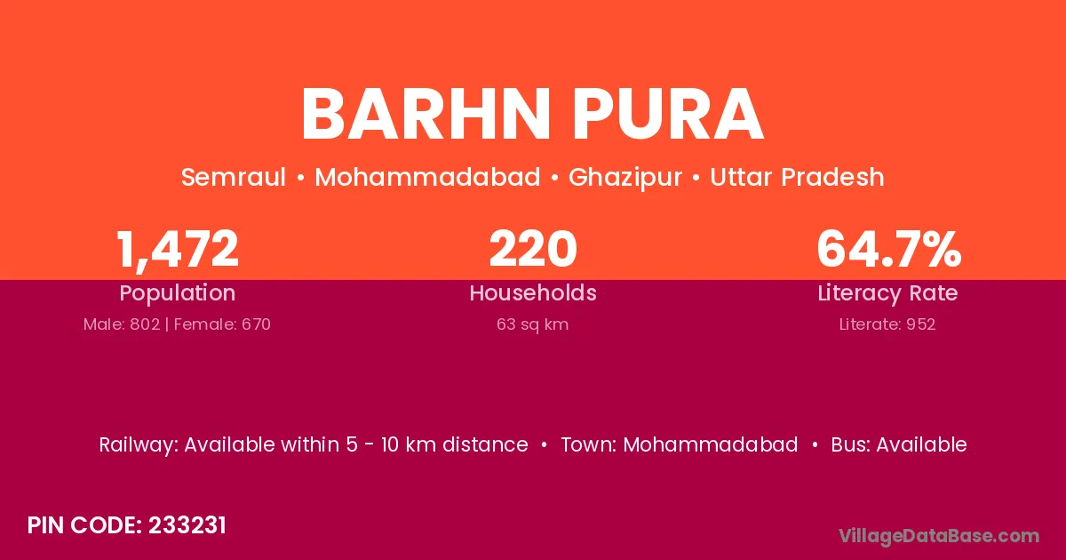 Barhn Pura village has a total population of 1,472 people, of which 802 are males and 670 are females.