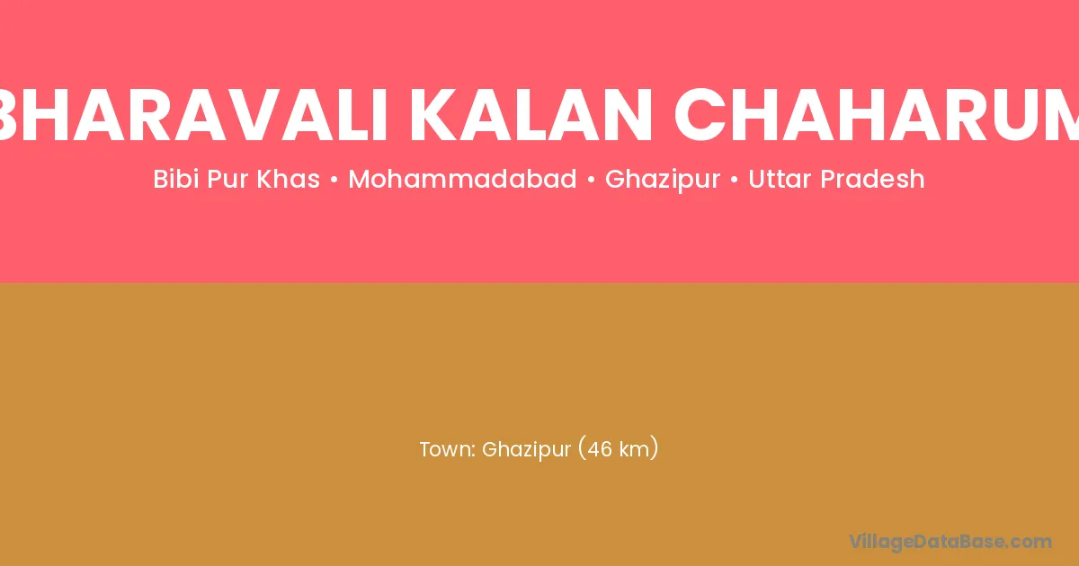 Ghazipur (46 km) is the nearest town to Bharavali Kalan Chaharum village for major economic activities and is located approximately 46 km away.