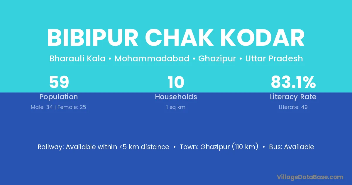 Ghazipur (110 km) is the nearest town to Bibipur Chak Kodar village for major economic activities and is located approximately 110 km away.