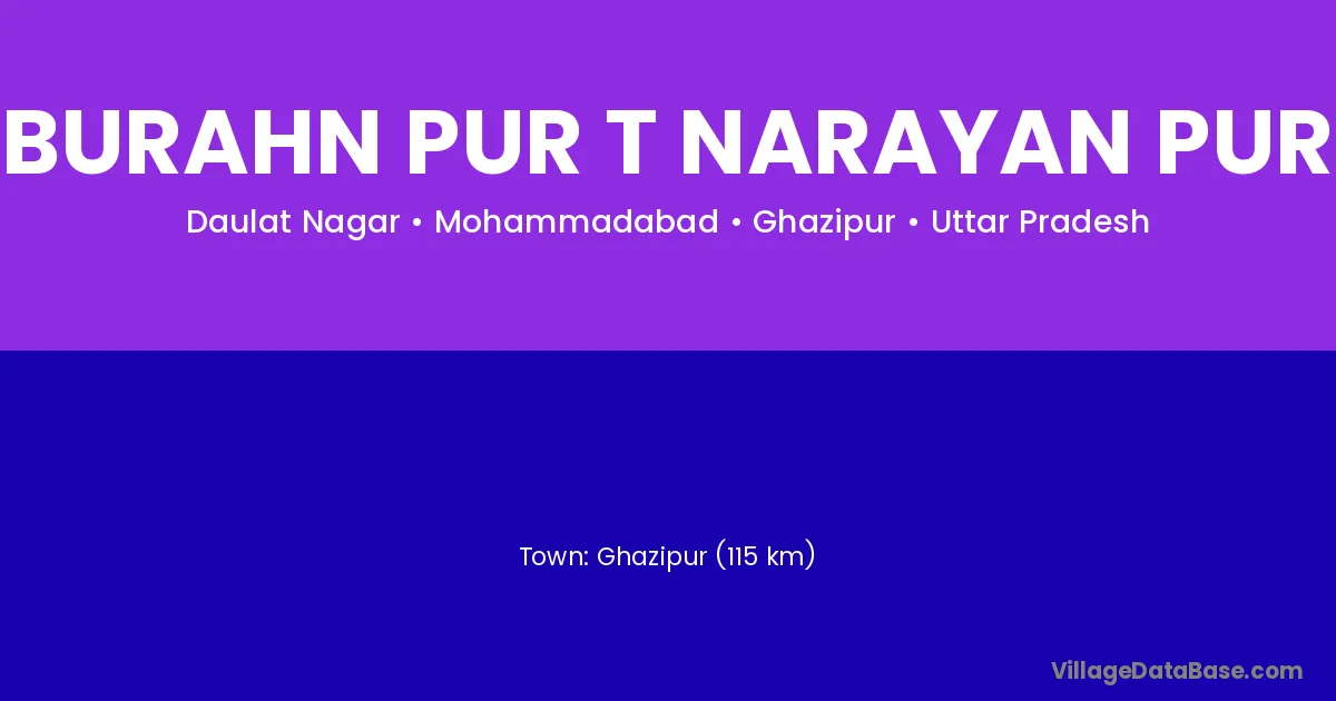 Ghazipur (115 km) is the nearest town to Burahn Pur T Narayan Pur village for major economic activities and is located approximately 115 km away.