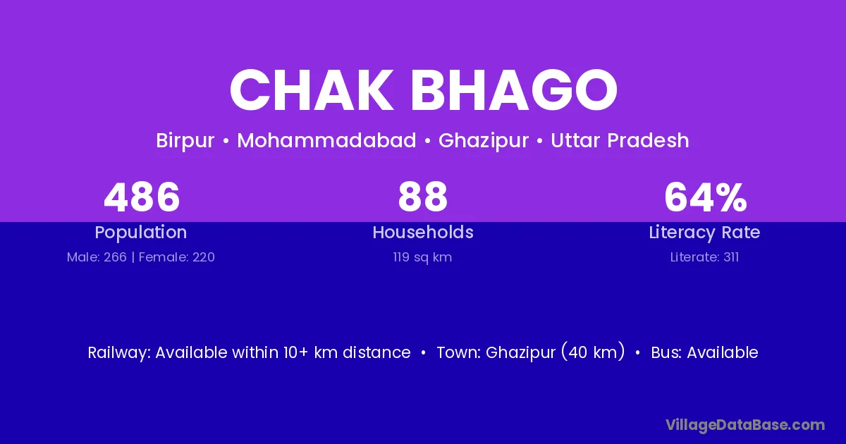 Ghazipur (40 km) is the nearest town to Chak Bhago village for major economic activities and is located approximately 40 km away.