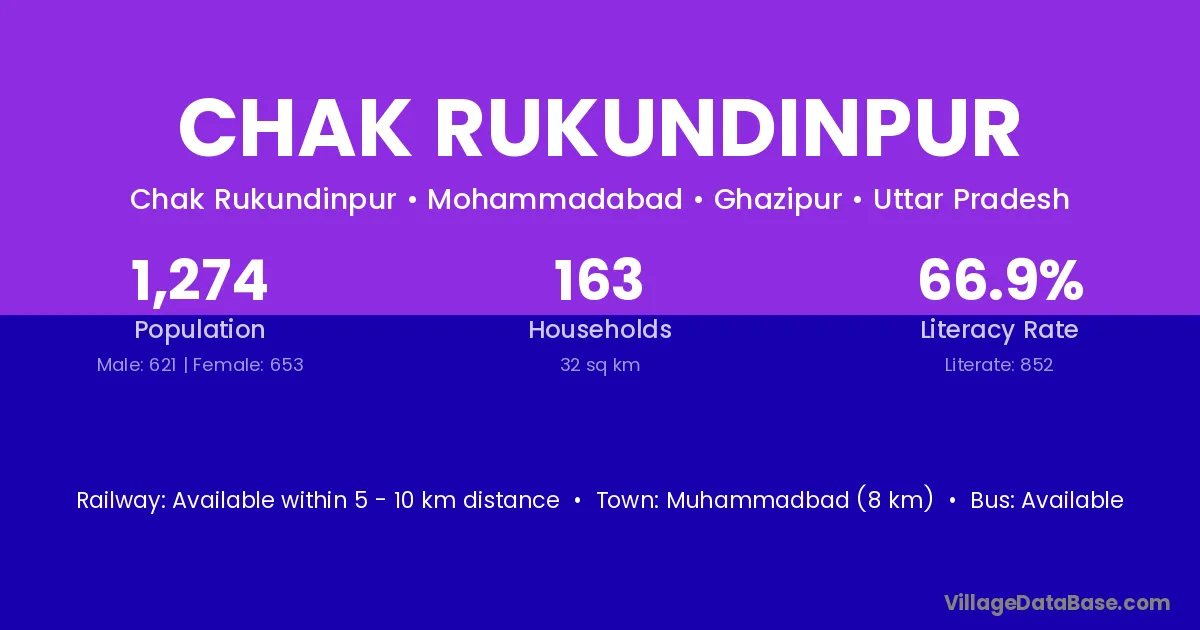 Muhammadbad (8 km) is the nearest town to Chak Rukundinpur village for major economic activities and is located approximately 8 km away.