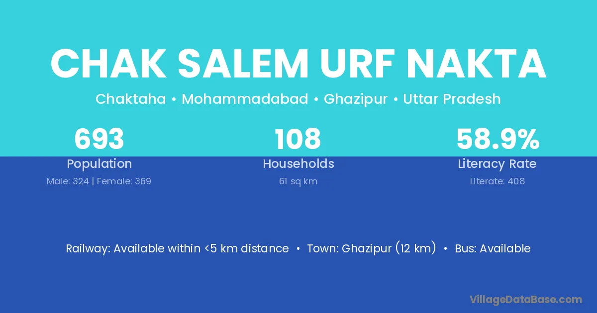 Ghazipur (12 km) is the nearest town to Chak Salem Urf Nakta village for major economic activities and is located approximately 12 km away.