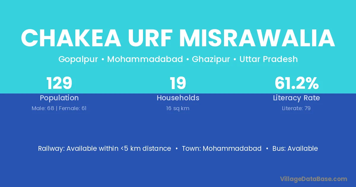Chakea Urf Misrawalia village has a total population of 129 people, of which 68 are males and 61 are females.