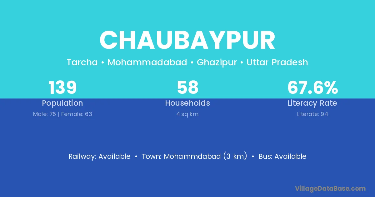 Mohammdabad (3 km) is the nearest town to Chaubaypur village for major economic activities and is located approximately 3 km away.