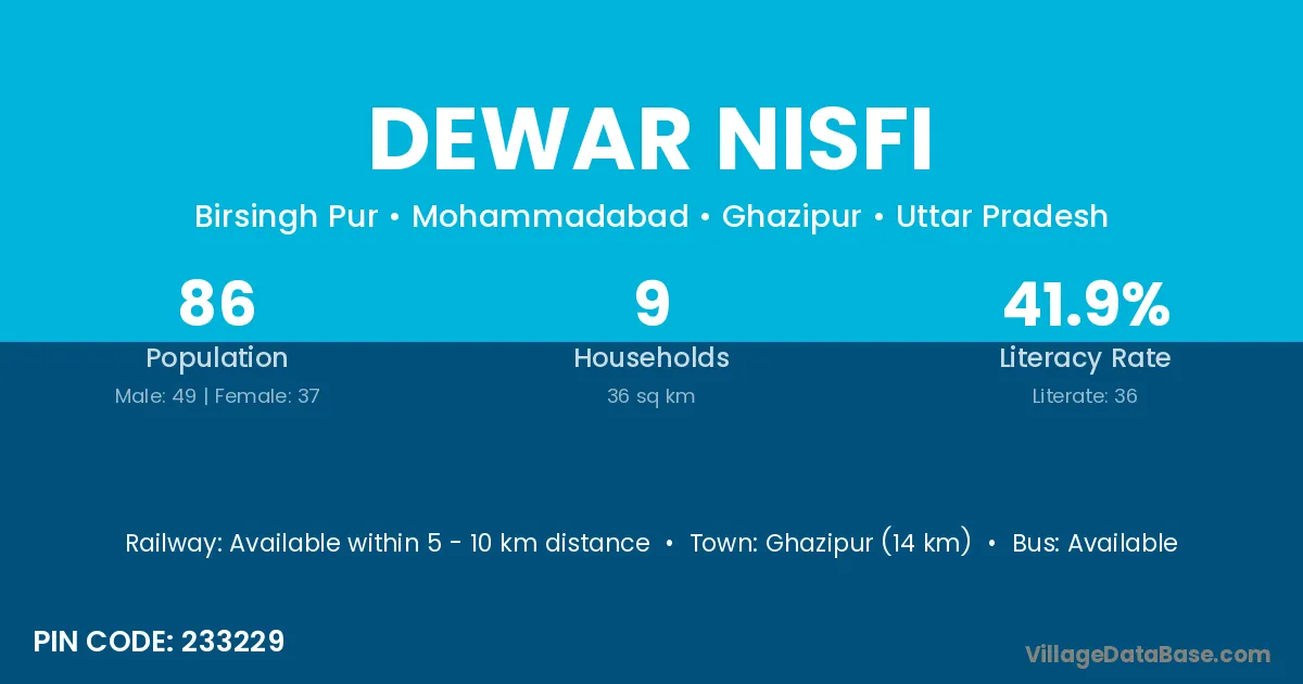 Ghazipur (14 km) is the nearest town to Dewar Nisfi village for major economic activities and is located approximately 14 km away.