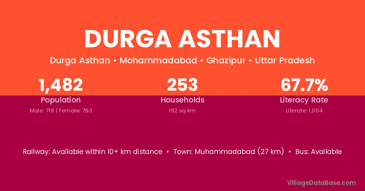 Muhammadabad (27 km) is the nearest town to Durga Asthan village for major economic activities and is located approximately 27 km away.