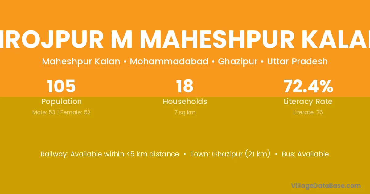 Firojpur M Maheshpur Kalan village has a total population of 105 people, of which 53 are males and 52 are females.