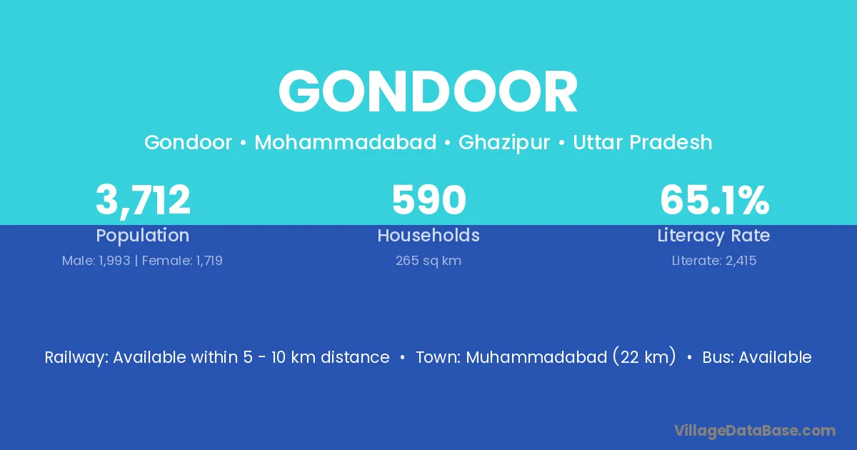 Muhammadabad (22 km) is the nearest town to Gondoor village for major economic activities and is located approximately 22 km away.
