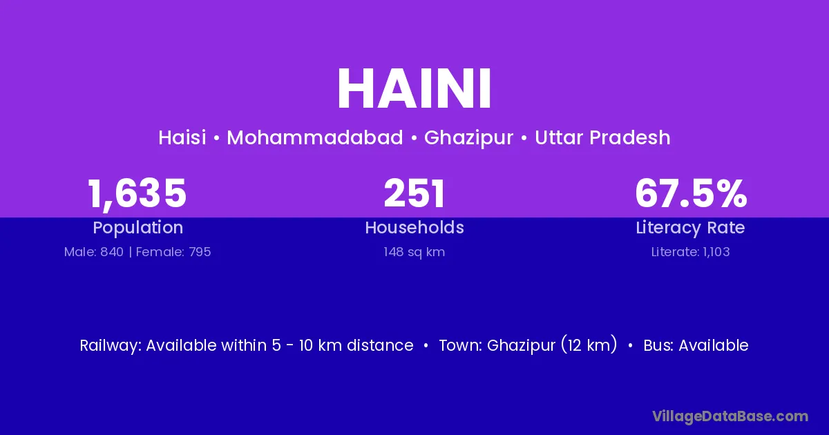 Ghazipur (12 km) is the nearest town to Haini village for major economic activities and is located approximately 12 km away.