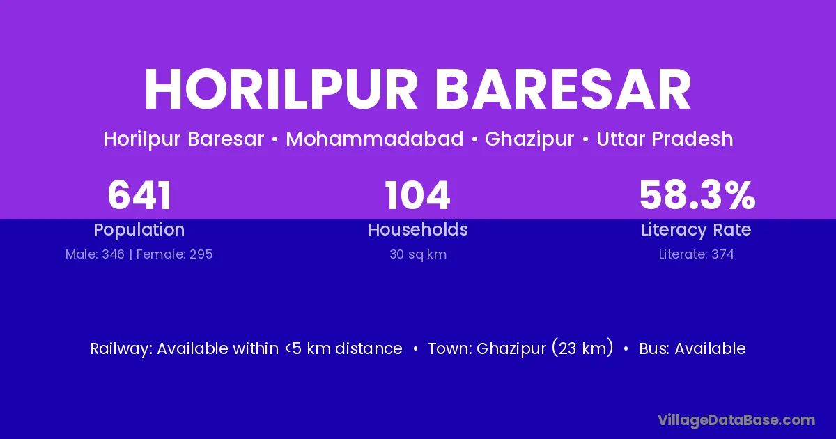 Ghazipur (23 km) is the nearest town to Horilpur Baresar village for major economic activities and is located approximately 23 km away.