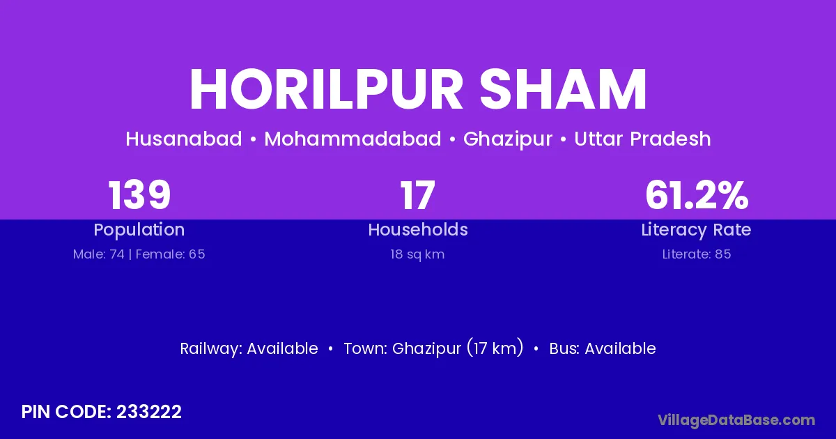 Ghazipur (17 km) is the nearest town to Horilpur Sham village for major economic activities and is located approximately 17 km away.