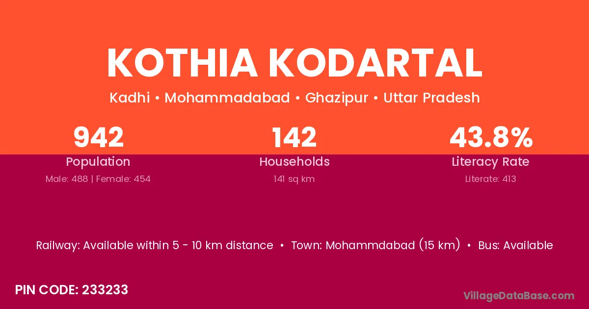 Kothia Kodartal village has a total population of 942 people, of which 488 are males and 454 are females.
