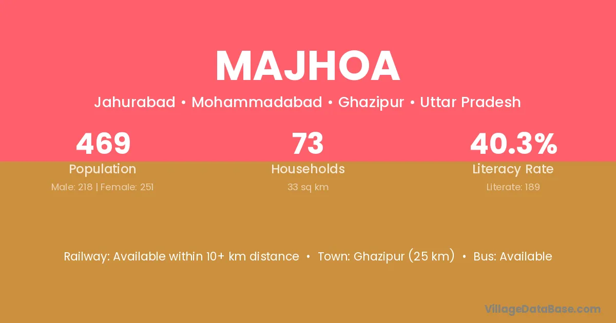Ghazipur (25 km) is the nearest town to Majhoa village for major economic activities and is located approximately 25 km away.