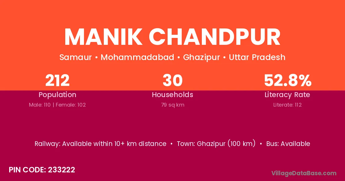 Ghazipur (100 km) is the nearest town to Manik Chandpur village for major economic activities and is located approximately 100 km away.
