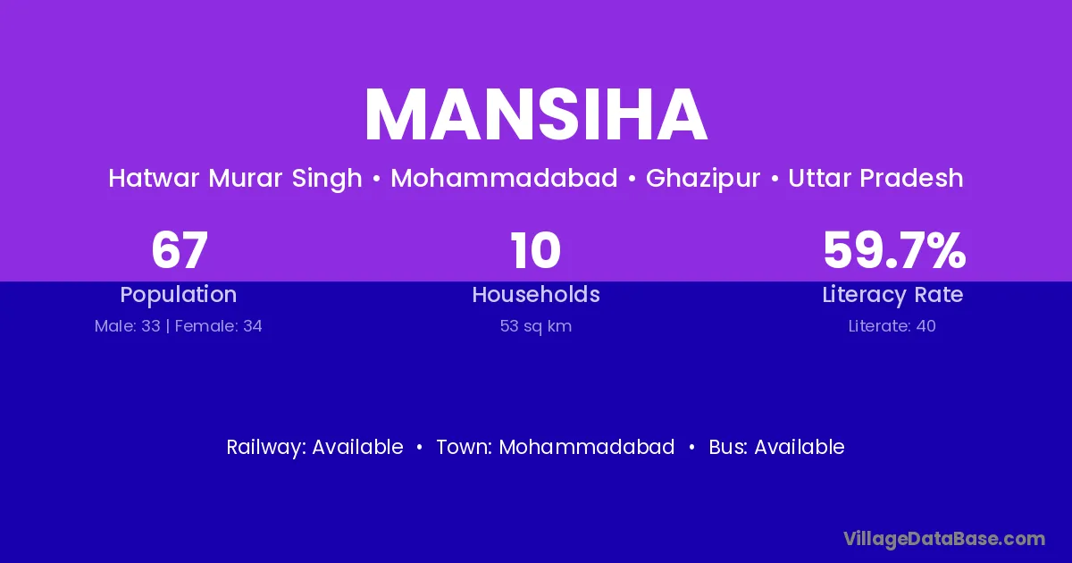 Mansiha village has a total population of 67 people, of which 33 are males and 34 are females.