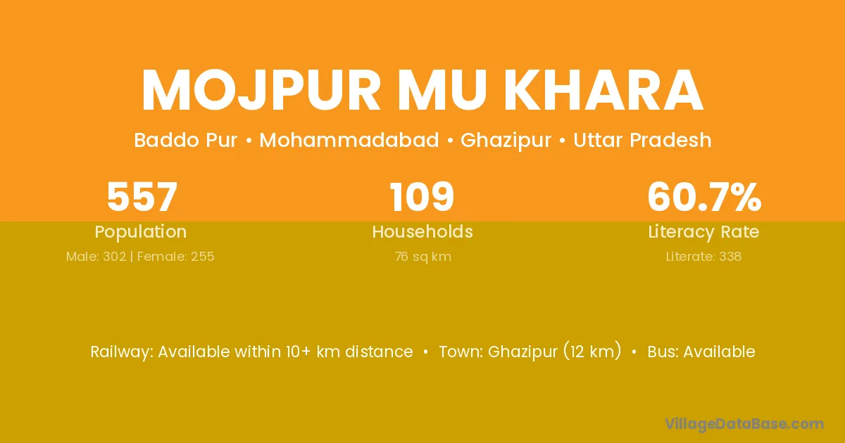 Mojpur Mu Khara village has a total population of 557 people, of which 302 are males and 255 are females.