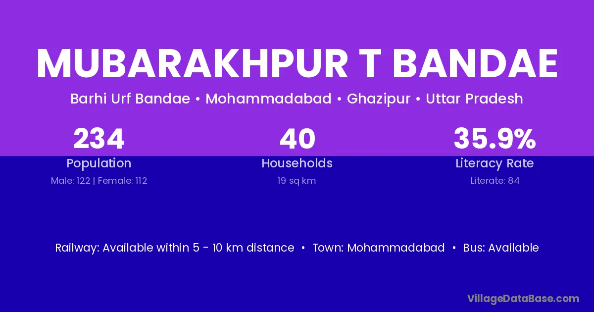 Mubarakhpur T Bandae village has a total population of 234 people, of which 122 are males and 112 are females.