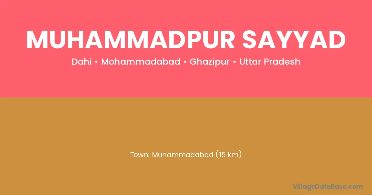 Muhammadabad (15 km) is the nearest town to Muhammadpur Sayyad village for major economic activities and is located approximately 15 km away.