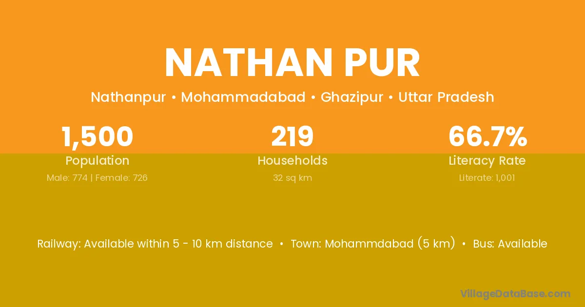 Mohammdabad (5 km) is the nearest town to Nathan Pur village for major economic activities and is located approximately 5 km away.