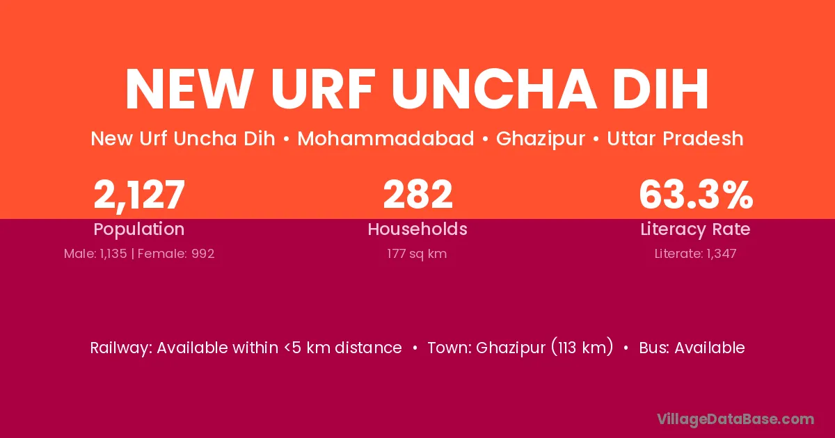 Ghazipur (113 km) is the nearest town to New Urf Uncha Dih village for major economic activities and is located approximately 113 km away.