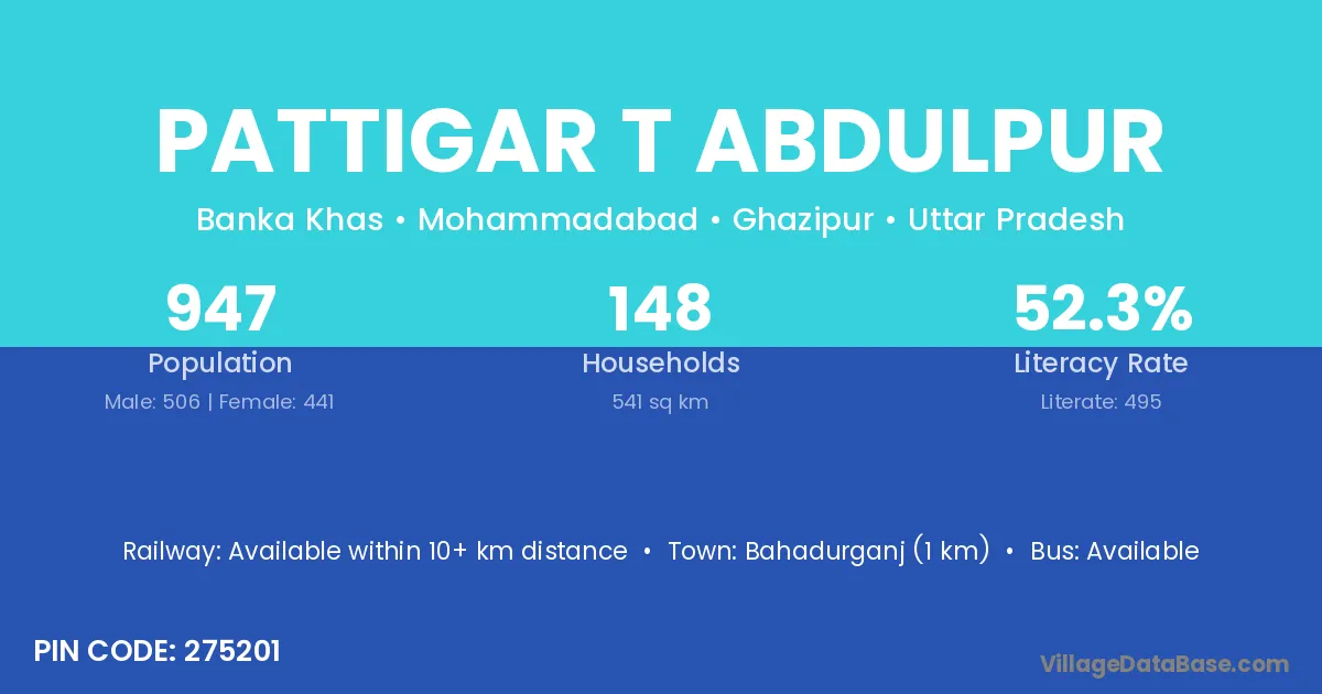 Pattigar T Abdulpur village has a total population of 947 people, of which 506 are males and 441 are females.