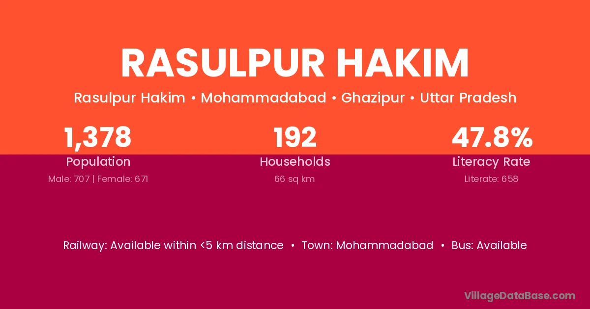 Rasulpur Hakim village has a total population of 1,378 people, of which 707 are males and 671 are females.