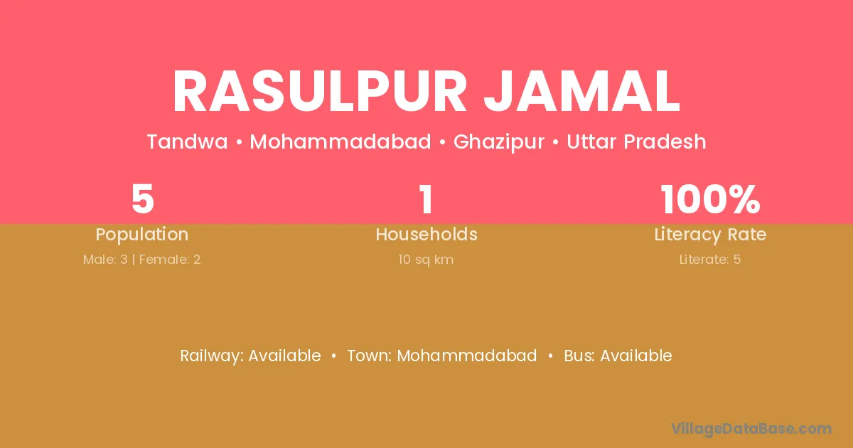 Rasulpur Jamal village has a total population of 5 people, of which 3 are males and 2 are females.