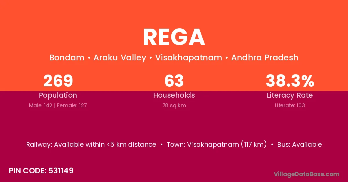 Rega village has a total population of 1,553 people, of which 825 are males and 728 are females.